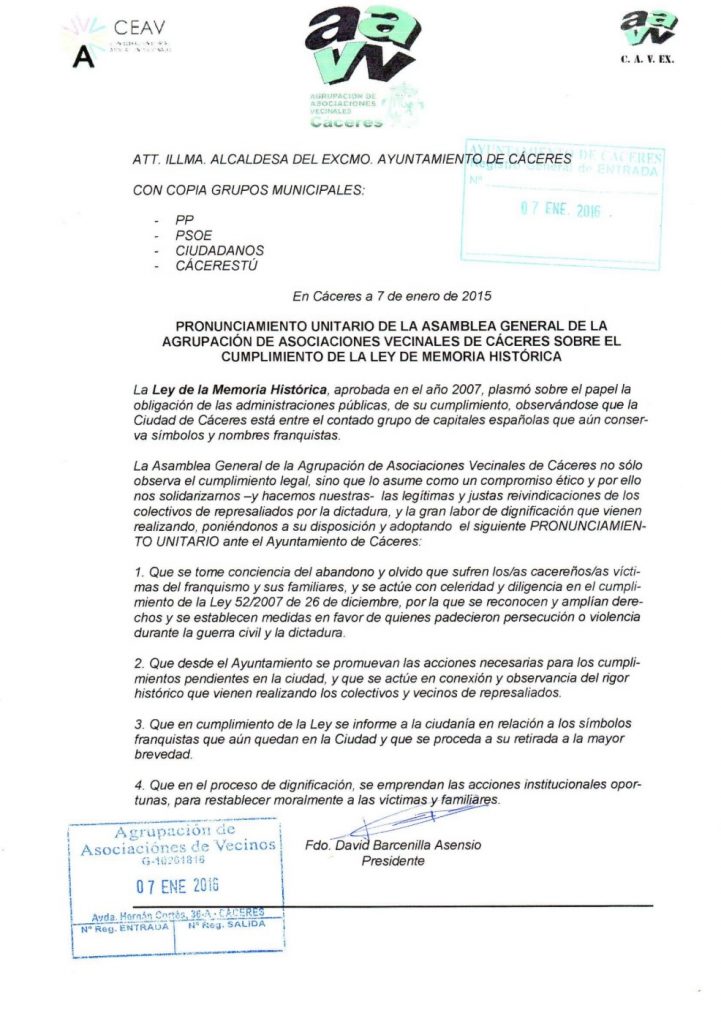 Recientemente la Agrupación de Asociaciones de Vecinos de Cáceres ha remitido al Ayuntamiento cacereño un pronunciamiento unitario en defensa del cumplimiento de la Ley de Memoria Histórica. El pronunciamiento fue aprobado el 30 de noviembre de 2015 pero no ha sido enviado al consistorio municipal hasta el 7 de enero de 2016. Para AMECECA este gesto es de gran relevancia y supone un respaldo a la tarea que nuestra asociación lleva a cabo en la capital cacereña en defensa de la memoria de las víctimas del franquismo y en pro de la eliminación de los vestigios y símbolos de la dictadura en nuestra ciudad. Os dejamos el documento de las asociaciones vecinales.